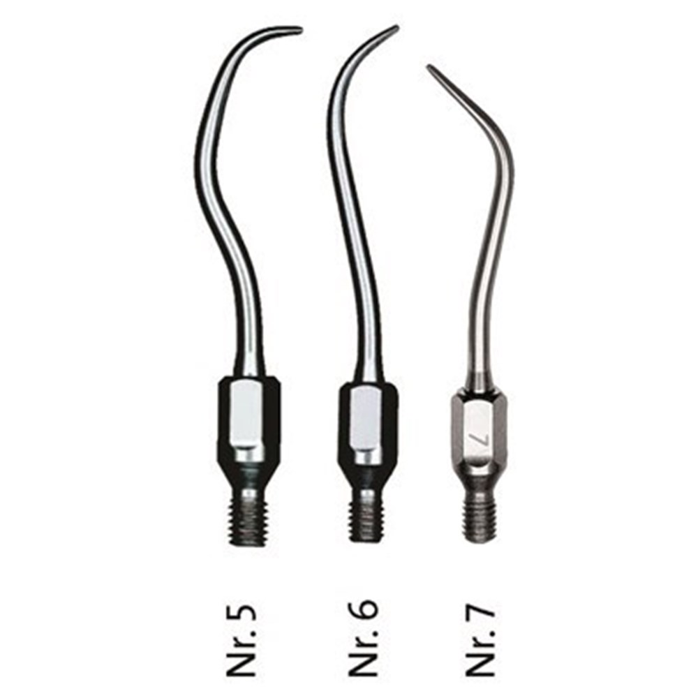 Universal, Sickle and Perio Scaler tips to be used to remove large areas of calculus.
