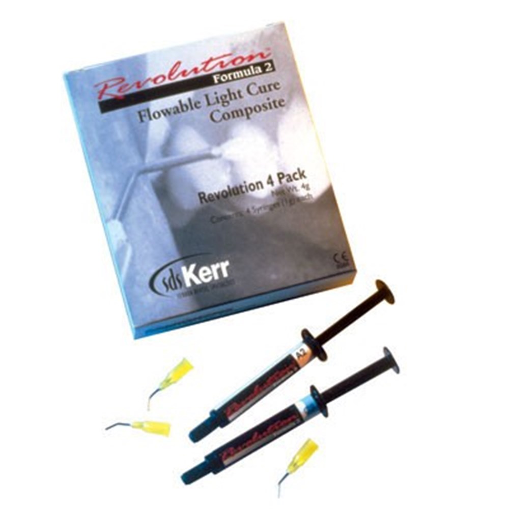 A flowable light cure hybrid composite for Class III, IV and V restorations. Revolution 2 is approximately 60% filled (by weight), achieving a viscosity that flows into cavity while providing the clinician with controllable, slump-resistant handling, Physical properties have been improved by increasing the compressive strength by over 10% and its fluoride-releasing. Revolution 2 is now available in the full range of Vita shades, as well as a pink gingival shade, two opaque shades, an incisal shade and even an extra light shade. In conjunction with the excellent polish and shine resulting from the 0.6 micron particle size filler, Revolution 2 is bringing new levels of aesthetics to flowable performance.