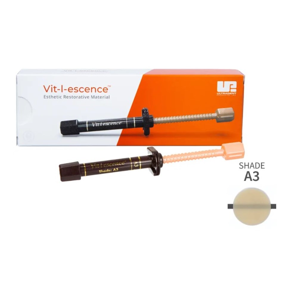 Vit-l-escence esthetic restorative material is a composite system that features the fluorescent and opalescent qualities of natural tooth structure. It is a Bis-GMA-based, radiopaque micro-hybrid system with an average particle size of 0.7µm.* Low-translucency, highly fluorescent dentin shades combined with high-translucency, opalescent/translucent enamel shades facilitate superior reproduction of natural teeth.