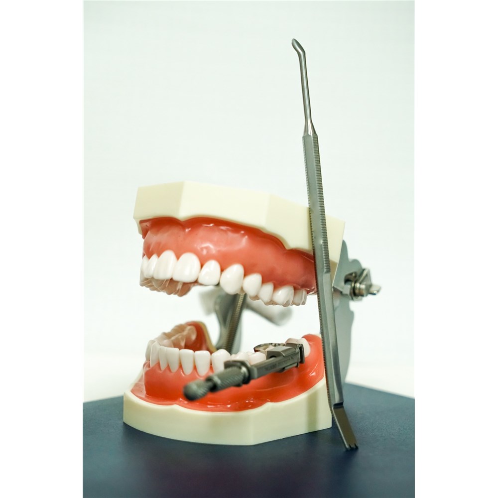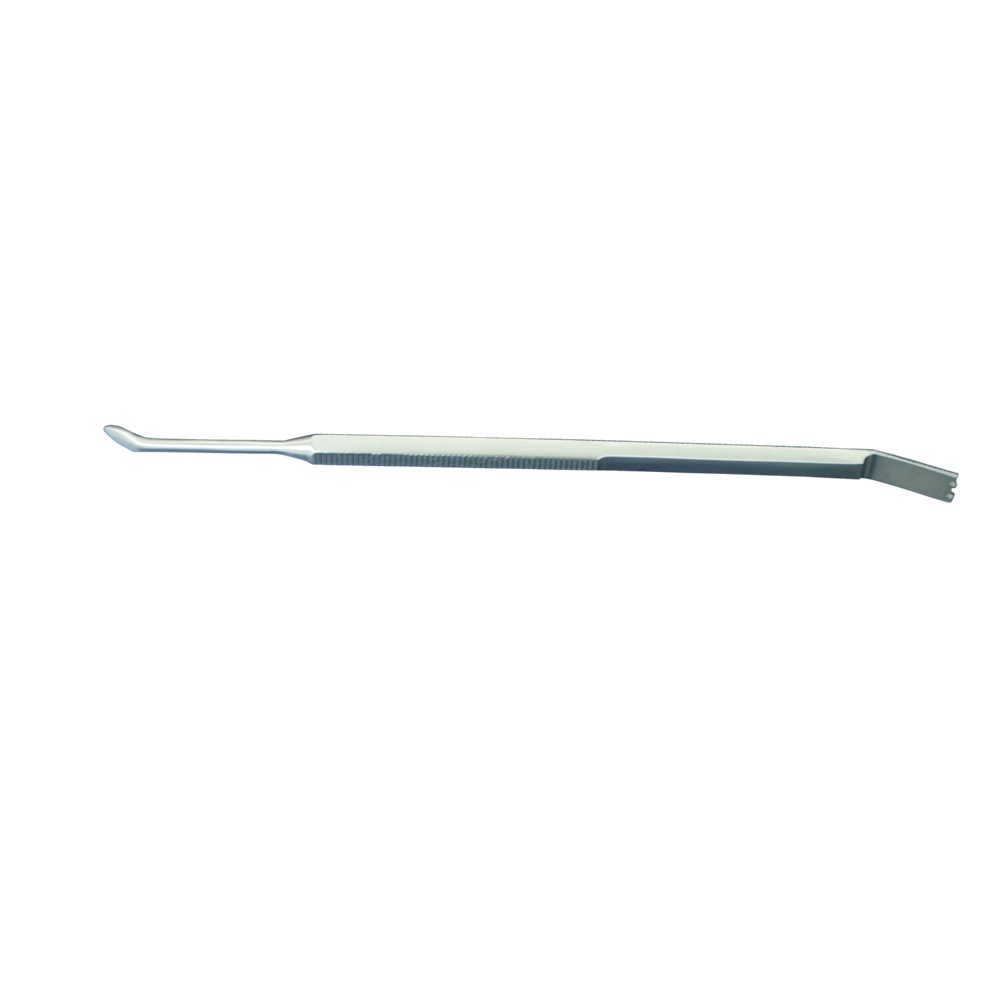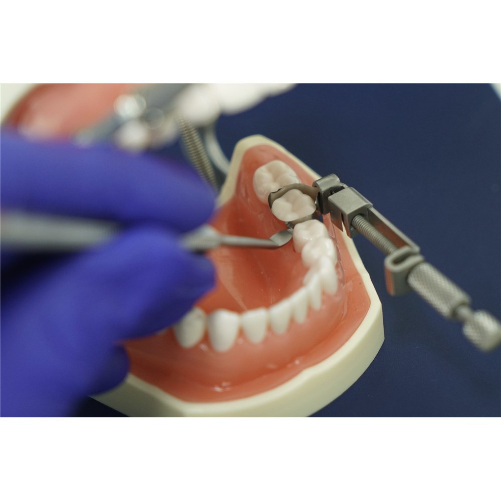 The Maestro Matrix Master features a double-sided design: one side facilitates the placement of matrix bands, while the other aids in their removal. The placement side incorporates a fork-like design with carefully positioned slots, enabling perpendicular engagement with the matrix band surface and facilitating precise force application. Additionally, it includes a knurled base that enhances grip when securing the band in the seated position during tightening. The opposite end of the Matrix Master utilises a teardrop to aid safe removal of the band.