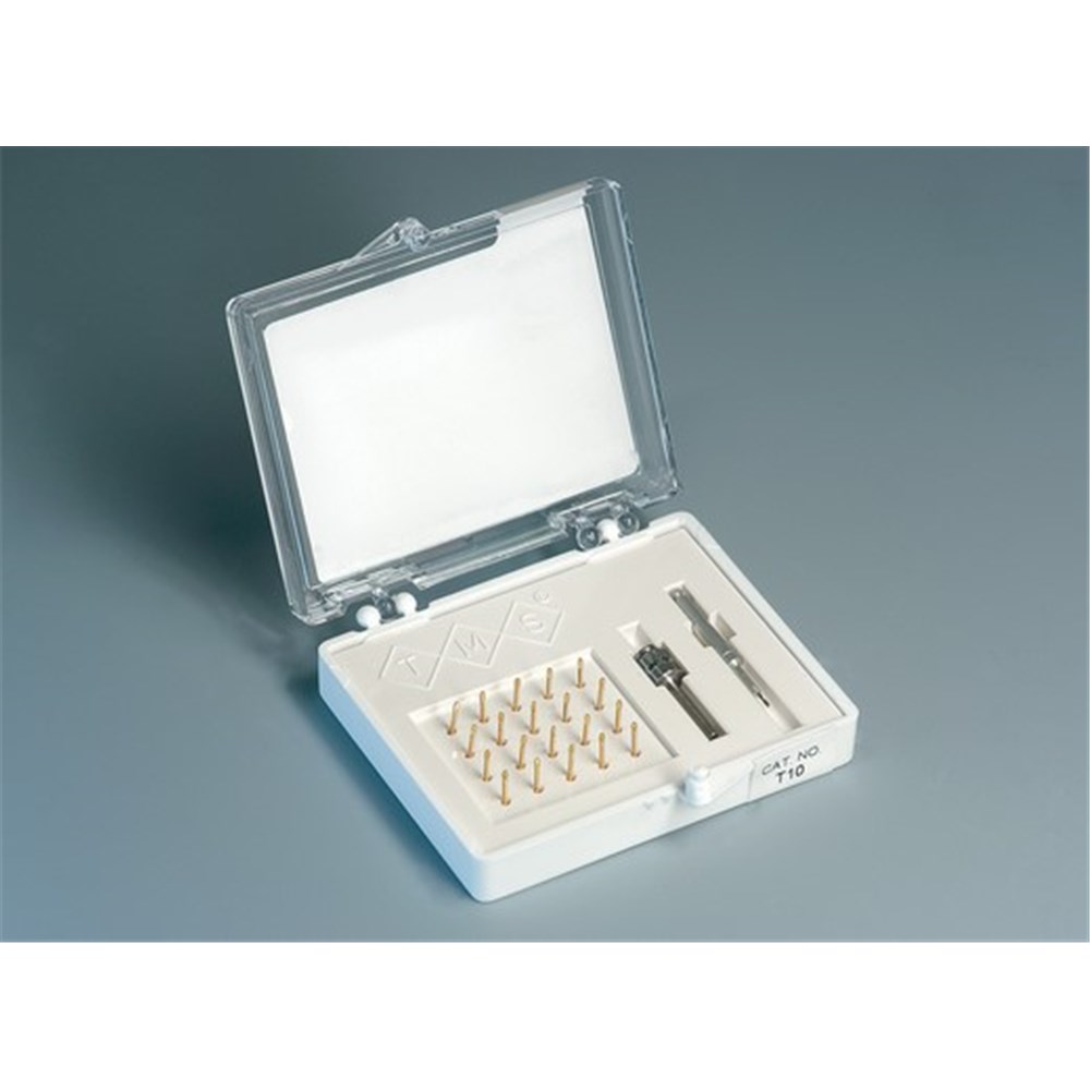 TMS pins are available as alpha-beta titanium alloy or gold plated stainless steel and four different sizes.