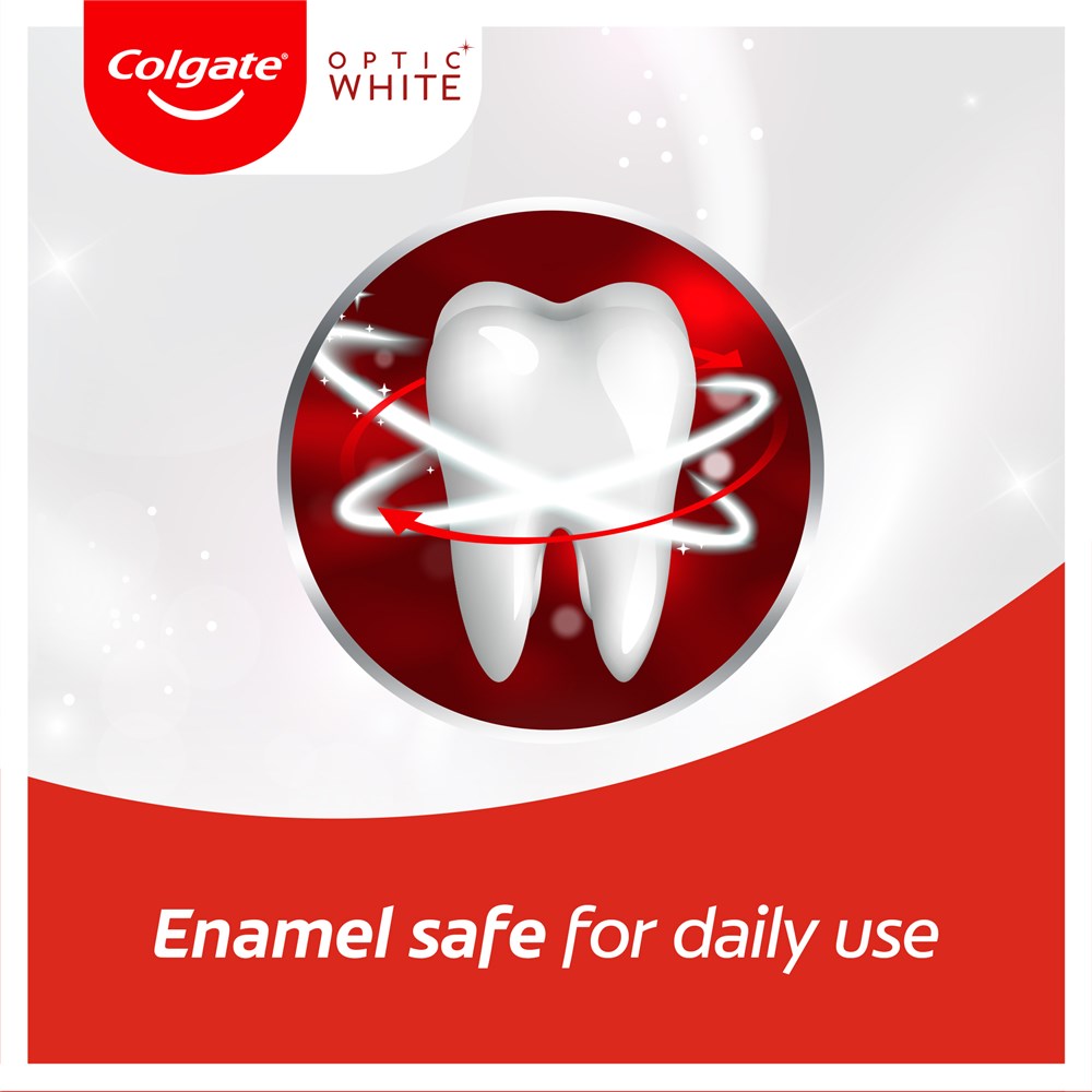 The Colgate Optic White Renewal Lasting Fresh Toothpaste 85g contains 3% Hydrogen Peroxide – Colgate’s highest level of hydrogen peroxide in toothpaste ever. It is enamel safe for daily use and provides cavity protection with 1000ppm fluoride content.