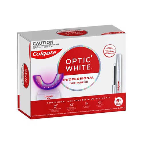 Reveal your whiter, brighter smile with Colgate® Optic White® Light-Up Dentist Exclusive Kit. A Professional, Take-Home Teeth Whitening Kit with an LED Teeth Whitening Device, Whitening Serum Pen and 6% hydrogen peroxide, for dramatically whiter teeth in 5 days*.