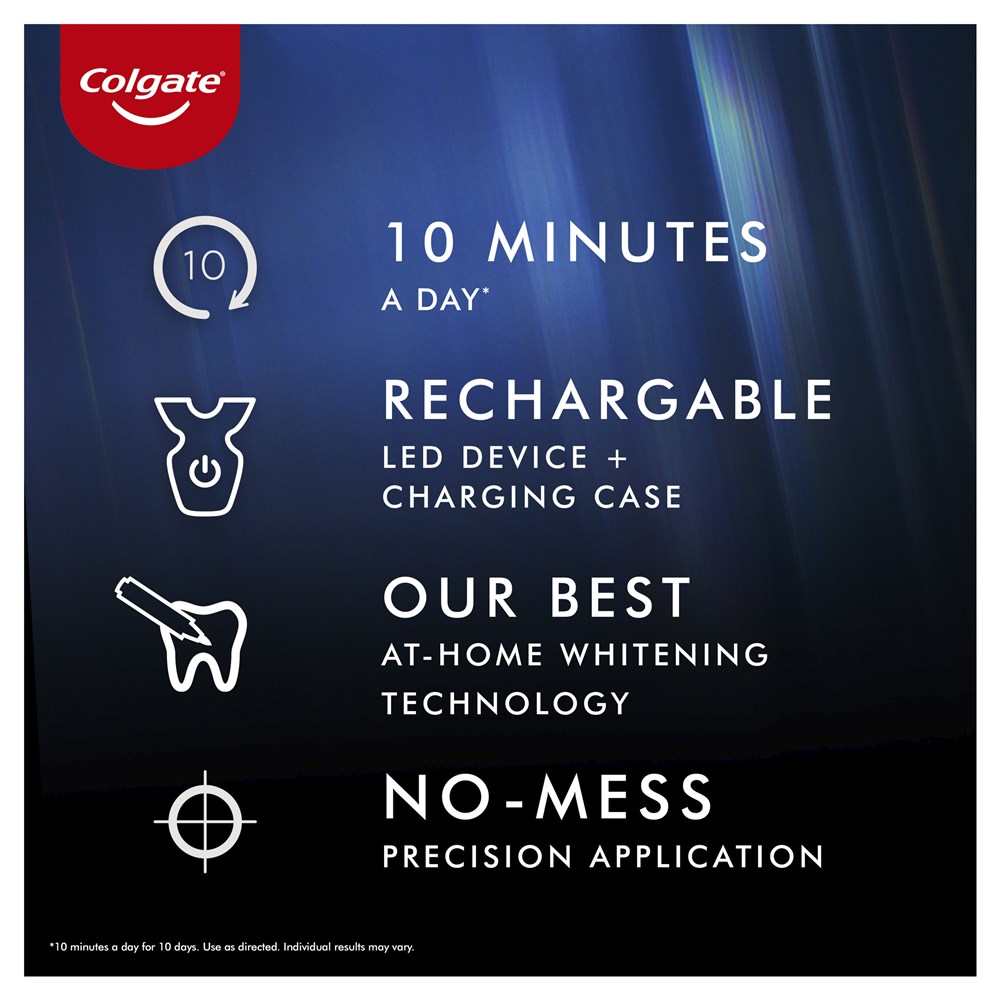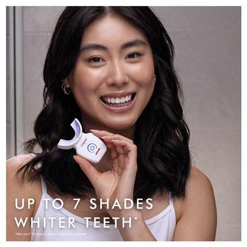 The LED device then uses light energy to amplify the whitening power of the concentrated film even further. This synergy between the formula and the device allows for whiter brighter teeth in just 10 minutes a day^. Recommended use after brushing and before bed.