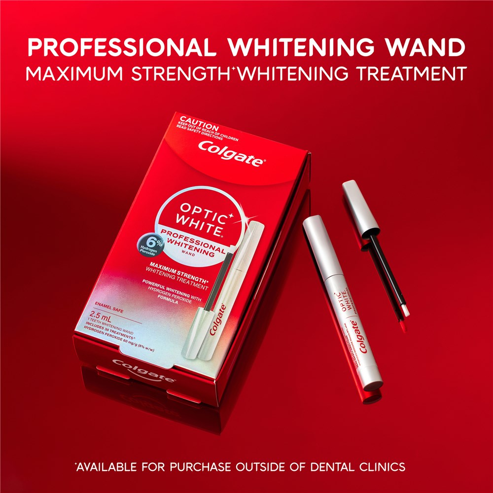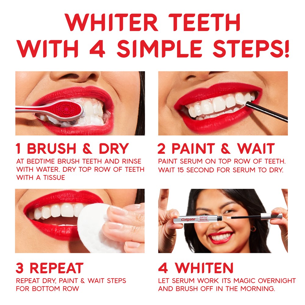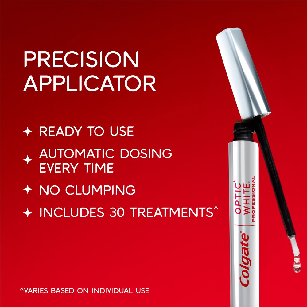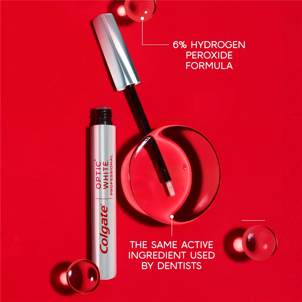 Reveal your whiter, brighter smile with Colgate Optic White Light-Up At-Home Teeth Whitening Pen. A Professional Teeth Whitening Pen exclusive to dentists. Whitening Serum Pen containing 6% hydrogen peroxide, for dramatically whiter teeth in 10 minutes a day for 10 days*.