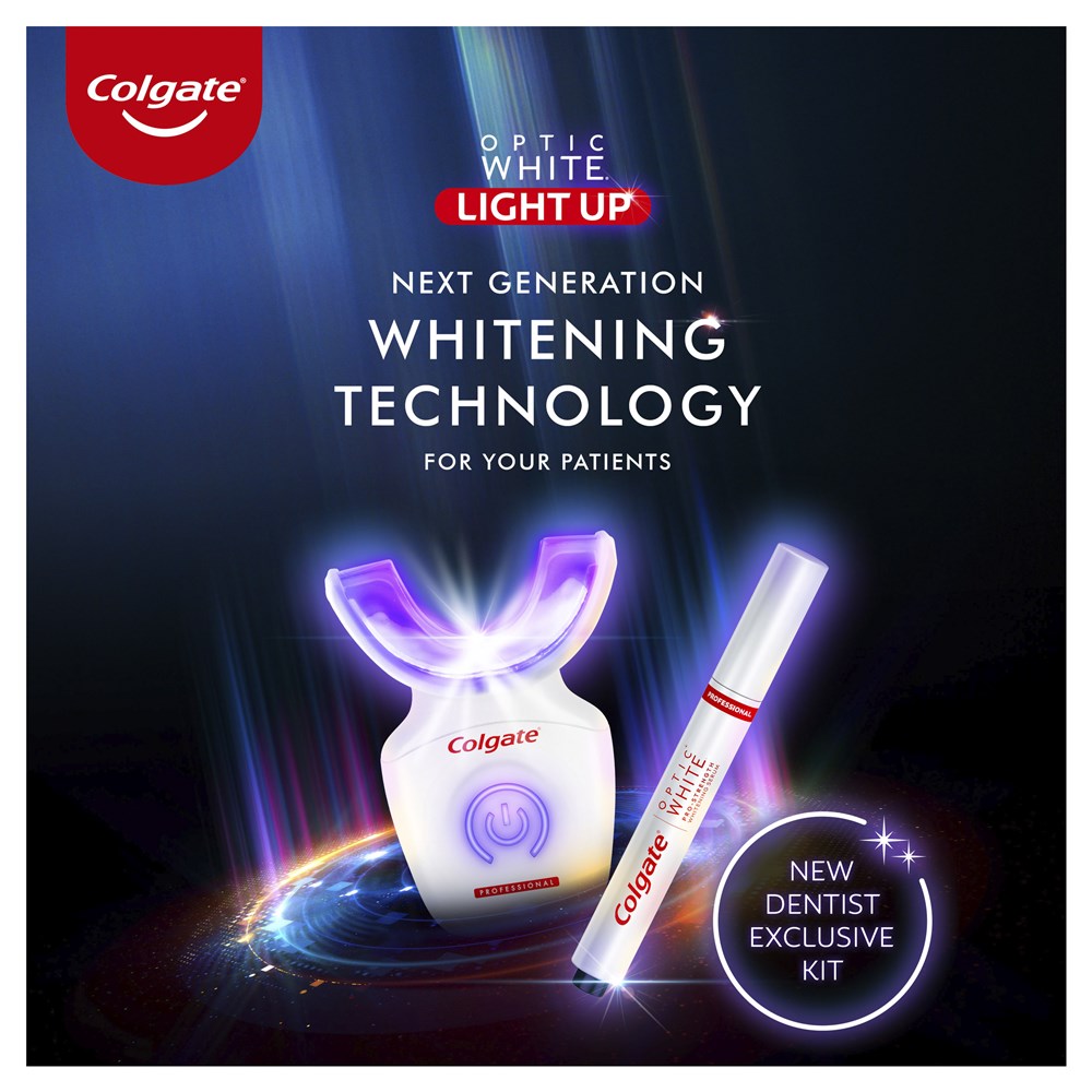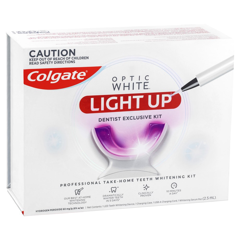 Reveal your whiter, brighter smile with Colgate® Optic White® Light-Up Dentist Exclusive Kit. A Professional, Take-Home Teeth Whitening Kit with an LED Teeth Whitening Device, Whitening Serum Pen and 6% hydrogen peroxide, for dramatically whiter teeth in 5 days*.