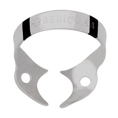 First the clamp is positioned intraorally, then the dental dam stretched over the clamp and tooth. Wingless clamps are designated with a „W“ (wingless) for easy identification.