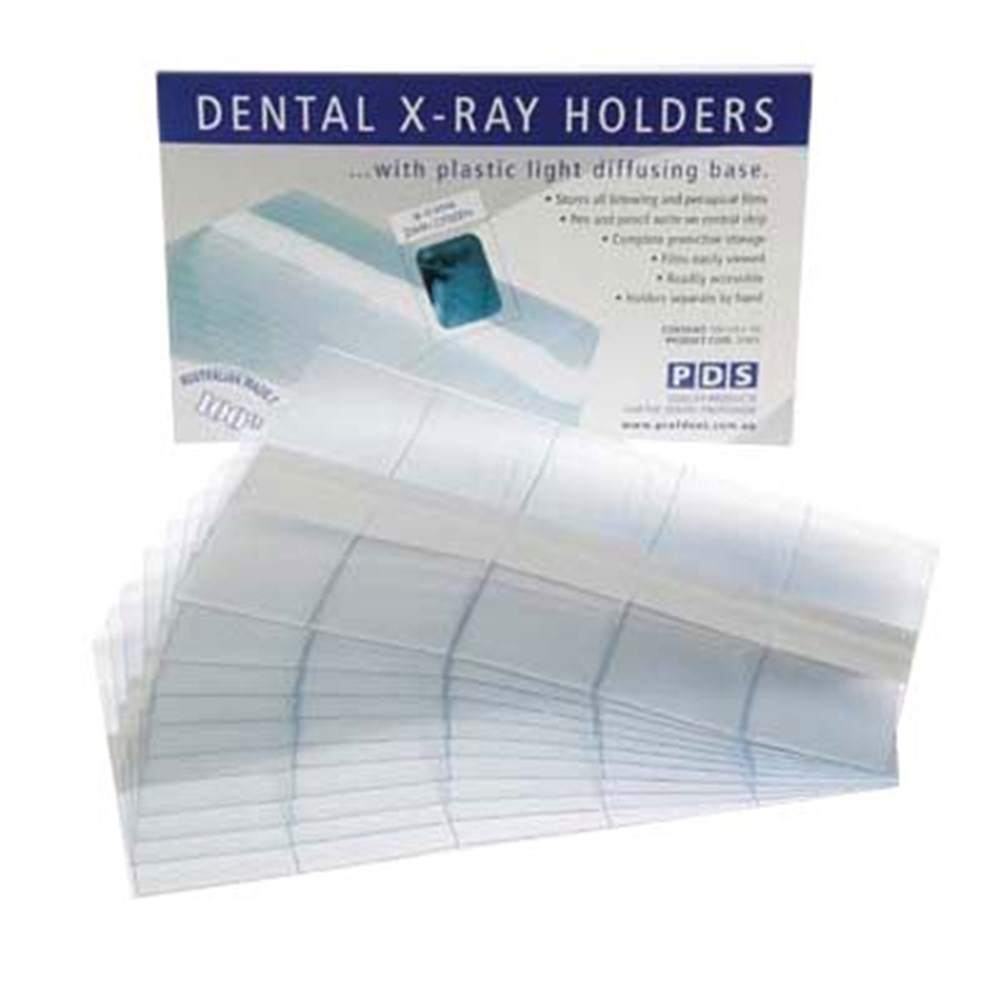 Plastic dental x-ray viewing and storage pockets with light diffusing base. Stores all bite-wing and periapical films. Central strip can be written on for patient I.D.